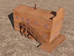 Two-story high wooden house, in the old west style, with a side staircase leading to the second floor. Building similar to version 10 but without a balcony facing the street. With chimney and smoke, it does not have night mode. Dimensions: 6m x 12m. Version 14A2. In this version the wood textures are reddish-brown