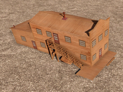 Two-story high wooden house, in the old west style, with a side staircase leading to the second floor. Building similar to version 10 but without a balcony facing the street. With chimney and smoke, it does not have night mode. Dimensions: 6m x 12m. Version 14G22. In this version the wood textures are reddish-brown