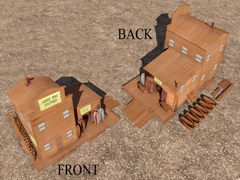 Two-story high wooden house, in the style of the old west, with a side staircase to access the second floor and an attached warehouse. With chimney and smoke, it does not have night mode. Building dimensions: 6m x 7m, and the warehouse 6m x 6m. Version 15E2. Building used as a funeral home under the name of Alfred Dean, (Fictitious name). With coffins on display and lumber for construction. In this version the wood textures are reddish-brown