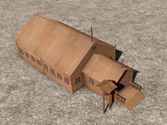 Wooden church and school, in the style of the old west, with an attached exterior covered bell, it has no night mode. Dimensions: 10m x 14m + 5m x5,5m. Version 11D2. In this version the wood textures are reddish-brown