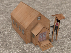 Wooden church and school, in the style of the old west, with an attached exterior covered bell, it has no night mode. Dimensions: 6m x 8m + 3m x3,5m. Version 11I2. In this version the wood textures are reddish-brown