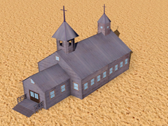 Wooden church and school, in the style of the old west, with two upper domes, one is a bell tower, it has no night mode. Dimensions: 10m x 14m + 5m x5,5m. Version 11A4. In this version the wood textures are blue-gray