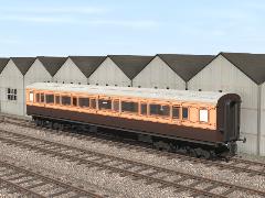 An enginespec for a LSWR Elliptical roof coach with plain bearing bogies also suitable for any other bogie coach of similar dimensions and weight. Uses real world values for surface area, moving friction coefficient and air drag coefficient. Braking values set to emulate vacuum brake performance.