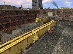 Yellow markers between the rails represents an interactive industry. When the industries are correctly configured freight cars will load and unload when spotted between the markers.