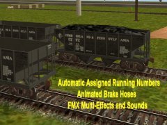 Accommodates CMTMSystem3 car destination system. 55 ton USRA/ARA 2bay hopper. 25,000 built in 1918 alone used mostly by eastern and midwestern coal carriers. Model by Dale Pattee. Most of these hoppers were built by American Car & Foundary. Automatic Assigned Running Numbers with animated brake hoses, and MFX multi-effect with sounds. Thanks to Eldavo and Wulf_9 for their signification contributions, and other dependencies by llj, prjindigo, whitepass and winnaa. Modified mesh and reskinned by majekear.