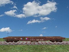 It accommodates the CMTMSystem3 car destination system and features auto-assigned running numbers in the range 90000-90499 using the NumberIt system by Eldavo. Numbers can also be manually assigned using the ? in Surveyor. The car has animated brake air hoses with sound and improved couplers. Works with Auran, Lars and ProtoLARS industry tracks. Select products from Caterpillar equipment, several farm tractors and more plus (2) Lumber, (2) 20ft and (1) 40ft Containers. LARS product loads 2 each of transformers, skid steer loaders (front-end loader), farm equipment, plastic pipe load, John Deere and Ford Tractors, Massey Harris 30 and 44 Tractors, Massey-Ferguson (front end loader), or lumber. Load 7 of Kabeholle quer 2m Durchm (Cable Roll/Spool), Wire Coil, or Auran general goods crates. Created from the rails up with gmax Trainz Asset Creation Studio and Jasc Paint Shop Pro. Many thanks to Eldavo for creation and assistance in operation his NumberIt system and to Dale Pattee for script editing.