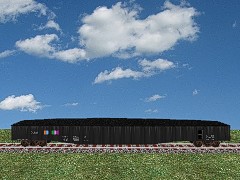 REVISED: Modified to accommodate CMTMSystem3 car destination system. Fixed load. WARNING: Uses 49 dependencies. This 65.5ft fishbelly 22 panel mill gondola was created with Gmax, Blender and Jasc Paint Shop Pro. Employees random assigned running number, animated air brake hoses, animated product loading and unloading, and Multi-effects library for sounds and smoke and dust colors. Carries loose bulk materials and general cargo itesm too. Many thanks to the creators of the dependency items. More thanks to bsnteng for modification of the script file.