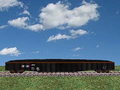 REVISED: Modified to accommodate CMTMSystem3 car destination system. Fixed load. WARNING: Uses 49 dependencies. This 65.5ft fishbelly 22 panel mill gondola was created with Gmax, Blender and Jasc Paint Shop Pro. Employees random assigned running number, animated air brake hoses, animated product loading and unloading, and Multi-effects library for sounds and smoke and dust colors. Carries loose bulk materials and general cargo itesm too. Many thanks to the creators of the dependency items. More thanks to bsnteng for modification of the script file.