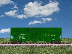 REVISED: Modified to accommodate CMTMSystem3 car destination system. Chicken Neck Foundry presents open top 3-bay highwall hopper with NumberIt automatic assigned running numbers with added dust clouds at loading and unloading. Can also change auto assigned number by using the ? in Surveryor. This animated car loads and unloads products such as Woodchips and Sand. Updated by Chuck Brite to carry Scrap Metal, Iron Ore, Brick Clay, Bauxite, Gravel, Nickel ore, Limestone Agregrate, Sand, Iron Pellets, Lump Surphur and Crushed Stone. Gmax rebuild of the Auran's art pack alias car adding smoke/dust attachment points, and couplers, pump and cylinder, and brake line, etc. Many thanks to Eldavo for creation and assistance in operation of his NumberIt system and LLJ for his products. Thanks also to Realsquash for the nice bogeys.