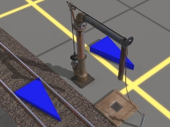 The crane's arm is animated. It will rotate anti-clockwise (track-acw) or clockwise (track-cw) by 90 degrees or 38 degrees depending on whether the loco's water port is centrally located (standard) or on a side tank, respectively. The presence of a side tank port is indicated to the water crane script by use of a 'yes' value for a 'lsp_side-tank' tag in the 'extensions' container of the vehicle's config file.