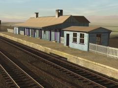 At night (6pm to 6am), the section of the platform surface, the main building wall and the areas under the main-building awnings will self illuminate, as do the interiors of the signal box,the SM's office and the general waiting room. Since all passenger attachment points are in the waiting room and under the awning lights, a night passenger set that self illuminates, <kuid:368725:35042>, will replace the day passenger set, <kuid:-25:1355>.