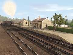 At night (5pm to 7am), the section of the platform surface, the main building wall and seating under the main-building awning will self illuminate, as do the interiors of the signal box and the waiting room. Since all passenger attachment points are under the awning lights, a night passenger set that self illuminates <kuid:95230:108004> has been utilised for both day and night modes.