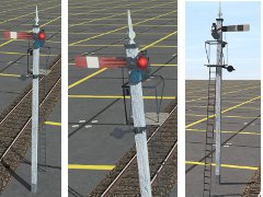 A lower-quadrant, mechanically-operated, semaphore starting signal with operation detection, mounted to the right of the track on a 22ft wooden post. Original oil lamp is still in place. The semaphore can take 2 positions over the lowerer quadrant: horizontal (STOP), and -50 degrees (PROCEED).