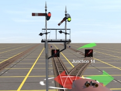 For correct automatic operation the signal must be used with directional feathers to uniquely identify the 2 possible paths indicated by each semaphore. Use <kuid2:60850:23901:4> 'Sig T Feather Straight' to mark the path of the Main semaphore; and <kuid2:60850:23921:4> 'Sig T Feather Right 1 (pos 4)' to mark the path of the Loop or Branch semaphore.