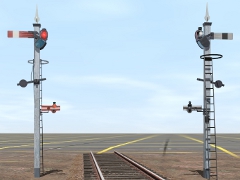 The original oil lamps of the semaphore signals are still in place. The starting semaphore can take 2 positions over the lowerer quadrant: horizontal (STOP), and -50 degrees (PROCEED).