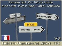 French directional road sign on the right 100x25 cm type D21 (1 line) for departmental road. The destination, with or without mileage as well as the addition of the little road sign with its number can be personalized (eg: NAME-CITY or NAME-CITY 7.5 / sign: D 123). VERSION 3 : NEW CORRECTED PBR TEXTURE - FBX/PBR Phiphitrainz 2023 3d object.