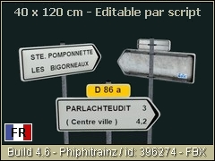 French directional road sign on the right 120x40 cm type D21 (2 lines) for departmental road. Destinations, with or without mileage as well as the addition of the little road sign with its number can be personalized (eg: NAME-CITY or NAME-CITY 7.5 / sign: D 123). FBX/PBR Phiphitrainz 2022 3d object.