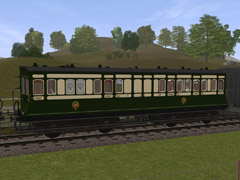 A Highland Railway composite lavatory luggage carriage to a design by David Jones. The coupe compartments with their characteristic swept ends have earned them the nickname of chariot end coaches.
