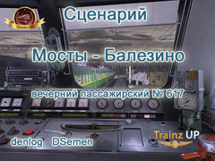 Мосты - Балезино, пассажирский № 617. Сценарий продолжительностью 1 час. Перейдите в кабину нажав клавишу 1 и подготовьте локомотив к работе. Отправление со ст.Мосты в 20.07. Отправляйтесь по расписанию и следуйте до ст.Балезино. Стрелки переключаются автоматически, а так же показания светофоров. Строго соблюдайте расписание! Проследуйте ОП и первую ст.Лельма без остановки. Первая остановка ст.Борисполь, следующая Крутоборка - пропустите скорый и следуйте по удалению с остановкой на ст.Топиллы. Конечная ст.Балезино. Рекомендуемая скорость на перегонах до Крутоборки - 100-110 км/ч , от Крутоборки до Балезино - 90-100 км/ч. Счастливого пути!