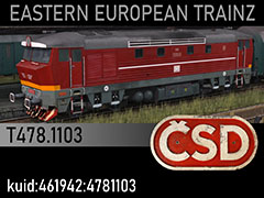 T478.1103 diesel locomotive of Veseli nad Moravou depot. The engine wears unified CSD paintscheme of 1982 with several individually decrated details. 3d kilanziom, photos kilanziom, textures Vojaa20, script RBach. This model was tested in TS19 with fixed light script. Use view details window to control all options of the model including lights, doors and the nightview.