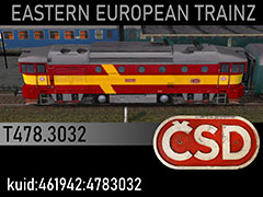 T478.3032 diesel locomotive from Zvolen depot, early 1990s paintscheme and lettering. In 1991 the engine was modernised to 750 class with electric heating. 3d kilanziom, photos kilanziom, textures vojaa20, script RBach. This model was tested in TS19 with fixed light script. Use view details window to control all options of the model including lights, doors and the nightview.