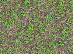 PBR environment ground texture. Brown soil, pebbles, soil and patches of green weeds.