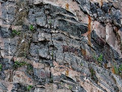 PBR environment ground texture. Metamorphic rock with vegetation and mineral stains.