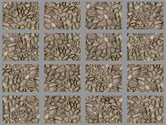 PBR enviorment texture. Re-sized & upgraded texture. Light brown various sized cobblestone pavers with pebbles and grass between stones.