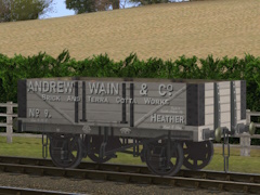 5 plank private owner wagon with outside diagional strapping in Andrew Wain, Heather livery. Has 3 stage LOD.