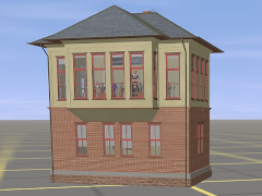 Pennnsylvania Railroad interlocking tower with a four-window wide bay, has brick first floor, wood second floor, nightmode, and 3 levels of LOD. Model includes interior details and attachment points for human figures. Model does not include attachment points for signs. Most dimensions and general appearance is based on the prototype Hunt Tower in Huntington, Pa, which still exists as a museum.