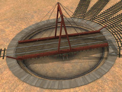 EDIT: Skirt hidden via alpha mask, attached rails changed to <kuid:648132:103267> by trainboi1. 50' wooden 'A'-frame turntable.Standard Central Pacific / Virginia and Truckee design; this particular example represents the Virginia & Truckee Railroad turntable in Virginia City, NV from 1876 through 1890.The pit dirt is a relatively close match to 'oz sand'.Revision 2: updated the table and pit models; improved the stub track placement and angles.