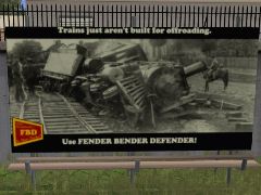 This billboard features the image 'trains just aren't build for offroading. Use FENDER BENDER DEFENDER!'.