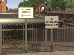 A sign telling passengers to use the side walk to access the platform instead of walking on the tracks to access the platform. Sign should be placed when there are no platform ramps and is near a grade crossing. This version has the arrow pointing to the left.