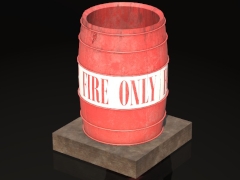 Fire barrel for protection of stations and other structures. This version has no lid, and sits on a wooden stand.