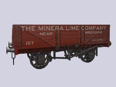 A 5 plank private owner wagon, Minera Lime Wrexham. The Minera Limeworks were once the largest lime workings in the north of Wales. The works closed in 1972. With thanks to Bob Sanders for the use of his original wagon model for reskinning.