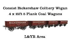 Four 15ft 5 plank Bickershaw Colliery coal wagons.