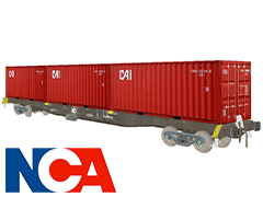Vagon Espina utilizado para el transporte de Contenedores. Esta versión esta configurada para cargar 3 contenderoes de 20 pies o 1 contenedor de 40 pies - Esquema: NCA - Contiene Telemetro