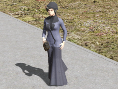 Female with blue dress and black hair, umbrella; basic model, created in Makehuman