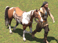Man wearing traditional Nez Perce clothes, leading a horse, created in Meshy.ai under paid license; mesh and textures have numerous imperfections. Hi poly model, approximately 16,000 polys, with 3 LODs.